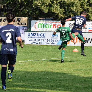 Danach kam es wieder zu einem Konter über Robin, welcher den Ball erlief, behauptete und in den Rückraum zu Jannik passte. Das Gehäuse der Blankenhainer schien völlig verwaist und somit konnte er ruhig unten links zur 1:0 Auswärtsführung abschließen (22.).